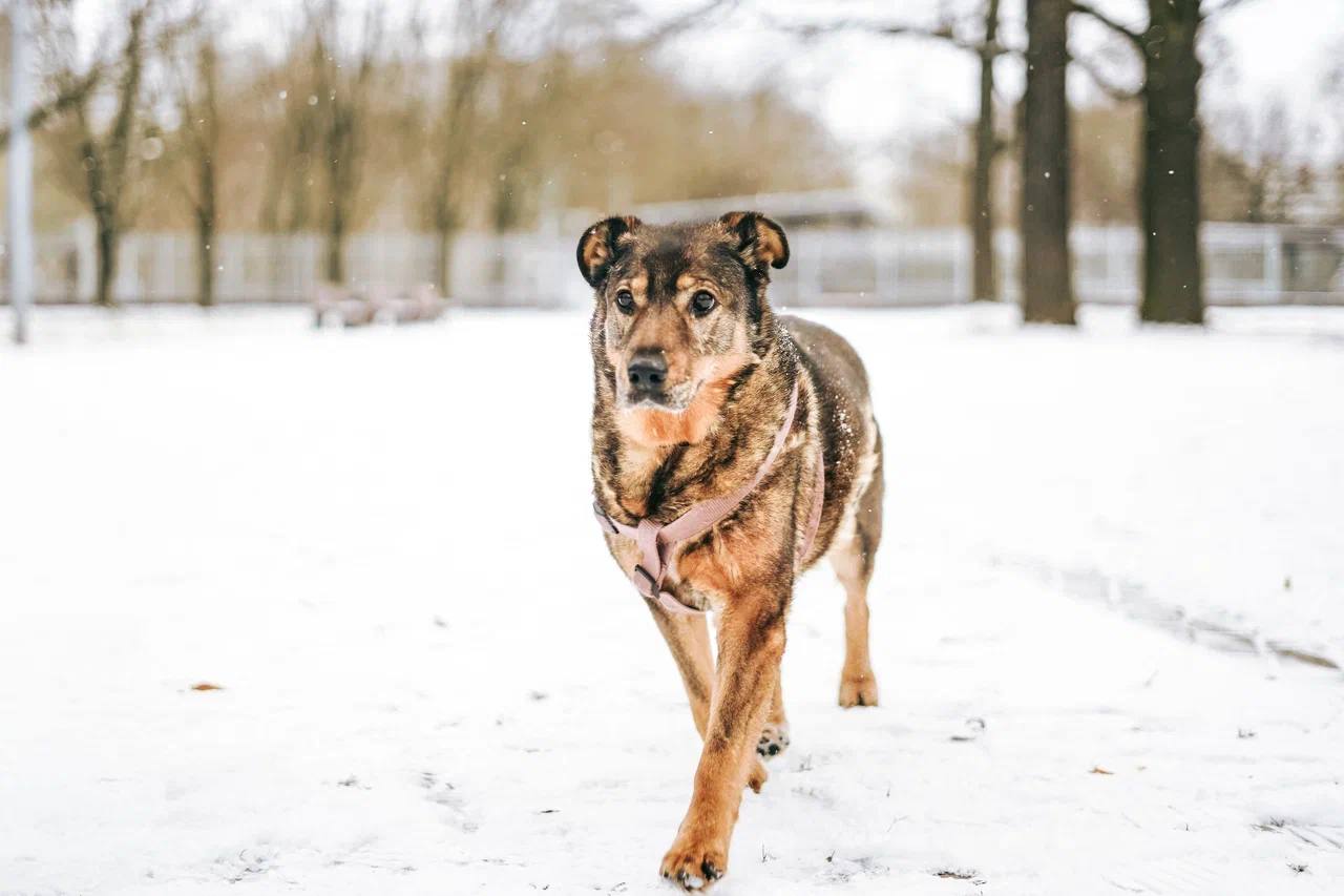 Мона легко вписалась в коллектив сородичей на ряду. Не агрессивна. Очень спокойная и не конфликтная. Сейчас наша малышка уже радостно виляет хвостиком, когда «свои» подходят к вольеру и очень ждёт прогулку!